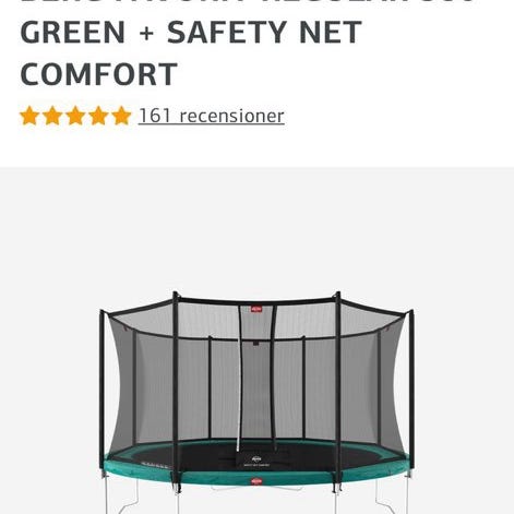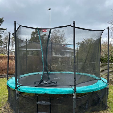 Oval form med ram i metall och skyddsnät runt hela hoppytan. Har förvarats inne under höst och vinter, allt nedmonterat just nu. Mindre repa när man går in men inget som påverkar funktionen.