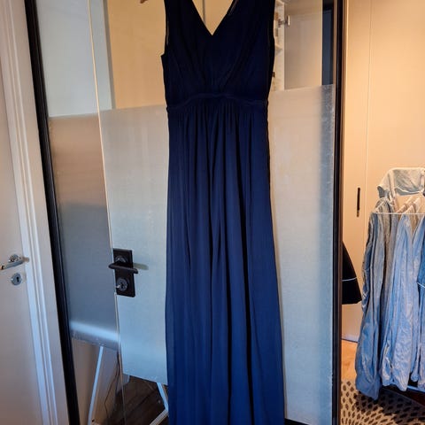 Festklänning för dam i storlek 36. Klänningen är blå och helfodrad med paljetter på överdel och kjol. Modellen har omlottskuren överdel med djup v-ringning och markerad midja. Längden är hellång, lämplig för fest, bröllop eller andra högtidliga tillfällen.