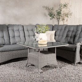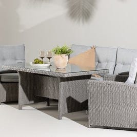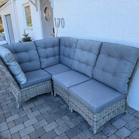 Soffa, två fällbara stolar och glasbord i grå konstrotting. Placerad på inglasad balkong så i mycket bra skick. Lite använd.