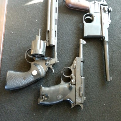 Samling, innehåller flera antika pistoler och 2 tillbehör för ammunition. Inkluderar olika typer av pistoler med trähandtag, samt en ammunitionstrumpa. plus hagelhorn,Perfekt för samlare eller som dekorativt inslag. Säljes i befintligt skick, ej brukbara