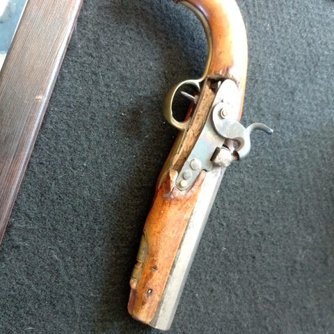 Antik dubbelpipig pistol med träkolv och metallpipa. plus 2 st enkelpipiga, Pistolen har två avtryckare och slaglås mekanism. Piporna är märkta med stämplar och kolven är utformad i trä med metallbeslag. Föremålet framstår som ett äldre samlarobjekt, lämpligt för den som samlar på historiska vapen eller antika föremål. Exakt tillverkare, modell, kaliber och tillverkningsår är inte angivna. Kommer från ett dödsbo, säljes i befintligt skick