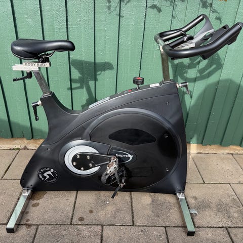 Spinningcykel i grå metallram med justerbart styre och sadel. Utrustad med stort svänghjul framtill och spd-pedaler . Lämplig för inomhusträning och konditionspass hemma. Mjuka maskinförare gör att den rör sig lite och känns mer som att cykla ute. Går tyst och utan missljud. Med effekt pedaler har du en komplett trainer som du kan köra swiftrace med.