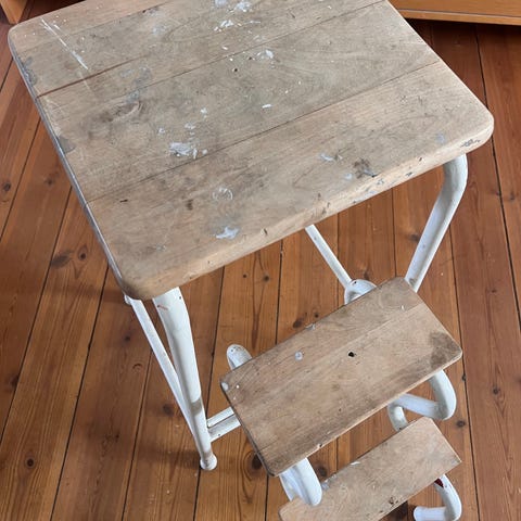 Äldre pall i trä och metall, hopfällbara steg