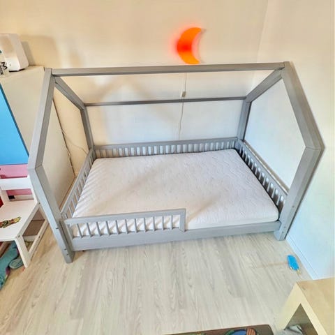 Sängen är hemmabyggd och nyligen ommålad i en “dusty pink”-nyans. Den målades när den var monterad, vilket innebär att den tidigare färgen kan synas på vissa ställen när den är nedmonterad. När sängen är ihopmonterad syns detta dock inte.