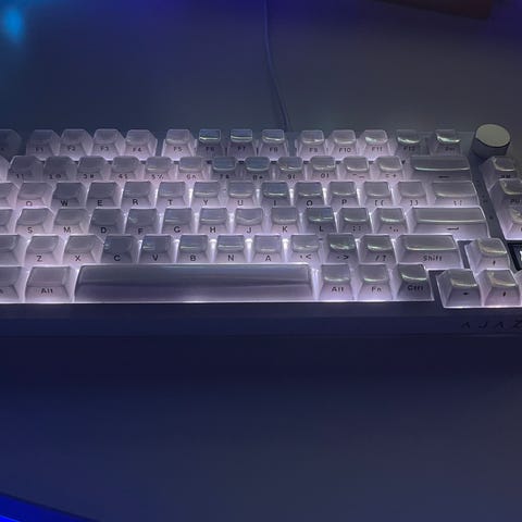 Akko 3068B Plus tangentbord i kompakt 65%-layout. Tangentbordet har mörkgrå och rosa tangenter samt en blå volymratt i övre högra hörnet. Anslutning sker via avtagbar kabel (USB-C till USB-A) och tangentbordet har även trådlösa funktioner enligt märkning på undersidan. Bakstycket har utfällbara fötter för justerbar skrivvinkel. Passar för användning med dator som kompakt skriv- och spel tangentbord där man vill spara plats på skrivbordet.