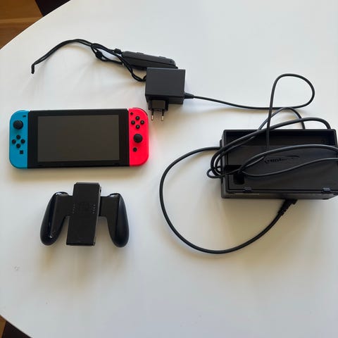 Nintendo Switch spelkonsol i färgen neon röd/blå. Handhållen och stationär spelkonsol med avtagbara Joy-Con-kontroller. På bilderna syns dockningsstation, strömadapter och övriga kvalar och tillbehör ingår. Fint skick på allt. Även 128gb minneskort ingår.
