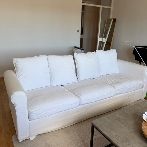 Soffan är i en ljusbeige färg. Sittdelen är djup och otroligt bekväm🤍