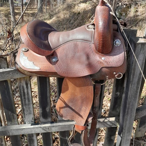 En mycket fin Western sadel med sadelväskor, brösta, sadelgjord och bakgjord. Mått ca 65 cm lång. Ca 53 cm från ytterkant framvalv till bakvalv sittdelen. Upplevs rätt stor och ligger säkert bäst på en stor och kraftig häst. Ca 15 cm bred i fram mellan putorna. Bomvidd ca 8 cm. Kan mötas upp längs vägen mellan Vetlanda och Stockholm