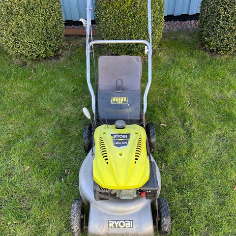 Ryobi RLM46160S gräsklippare med bensinmotor. Klippbredd cirka 46 cm. Utrustad med uppsamlare baktill och justerbart handtag. Färg gul och svart. Passar för klippning av gräsmatta i trädgård och andra grönytor. Funkar kanon . Finns i Kullavik
