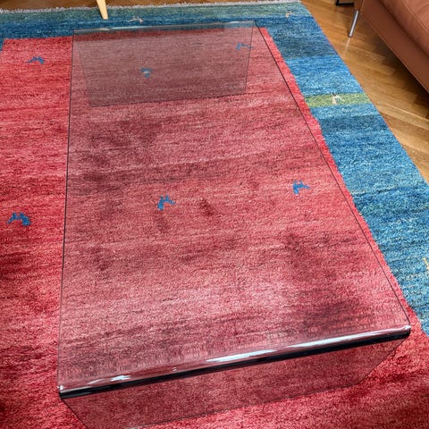 I fint skick, ser inga större repor på glasskivan. Benen är lite ”flammiga” i metallen, gissar att det går att putsa bort men vet inte helt säkert.
