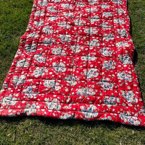 Inga skador förutom minimalt kantslitage ena kortsidan. Tveksam till material men troligen bomull/ull. Kan vara röllekan men tycker färgerna är för klara för att vara ren ull. Inga signaturer.