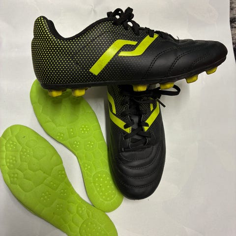 Skorna har överdel i syntetmaterial i grönt och blått med snörning och mellanhög skaftdesign. Dobbarna är anpassade för spel på natur- eller konstgräsplan. Passar barn eller personer med mindre fötter som behöver fotbollsskor i storlek 35.