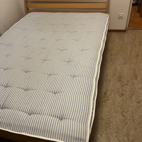 Ovanpå en tjock, tvättbar, bäddmadrass från Sverige sängen. Sängram i trä.