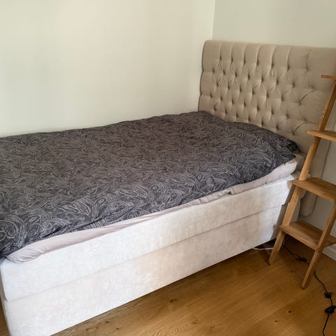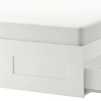 IKEA säng med förvaring i vit färg. Sängen har utdragslådor under liggytan som ger extra förvaringsutrymme för till exempel sängkläder eller kläder. Till sängen hör en vit sänggavel med inbyggda hyllor på sidorna för förvaring av böcker eller andra mindre saker. Passar som komplett sänglösning i sovrum där extra förvaring önskas.