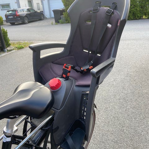 Hamax cykelsits för barn, maxvikt cirka 22 kg. Modellen har hög rygg, armstöd och inbyggt ryggstöd med reflex baktill. Justerbara säkerhetsbälten och fotstöd med remmar.