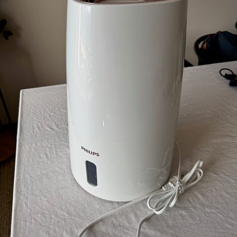 Philips HU4816 luftfuktare i vit färg. Modellen drivs med 220–240 V, 50/60 Hz och har en effekt på 19 W. På ovansidan finns panel med strömknapp, timerfunktion och inställning för fläkthastighet. Utrustad med vattenbehållare framtill med nivåfönster samt nätkabel baktill. Avsedd för inomhusbruk för att höja luftfuktigheten i rummet.