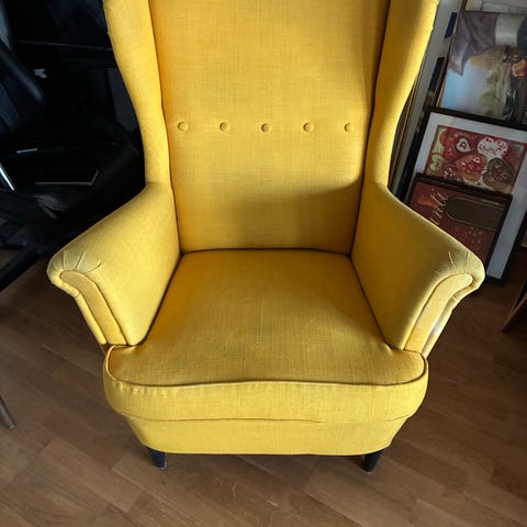 Gul karmfåtölj renoverad av tapetsör.