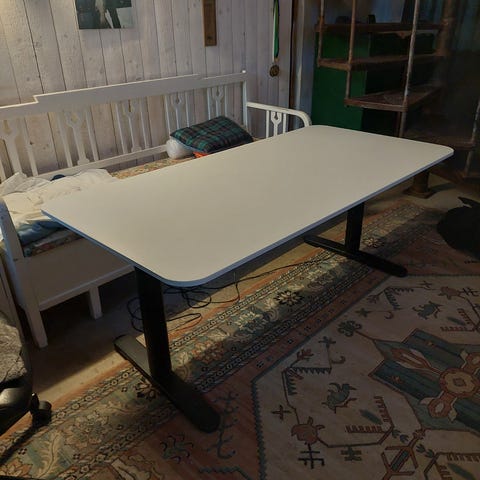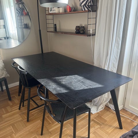 Säljer fint matbord pga renovering. Man kan duka för 6-8 personer (stolar och lampa ingår ej). Designen och storleken gör att det även är snyggt som skrivbord (80x160 cm).
