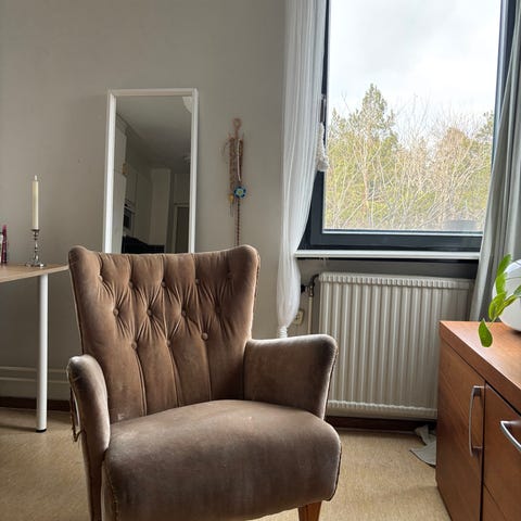 Fåtöljen är i nyskick och mycket sparsamt använd, vilket gör att den känns som ny. Perfekt för dig som vill skapa en lugn och stilfull hörna att sjunka ner i med en bok eller en kopp kaffe.