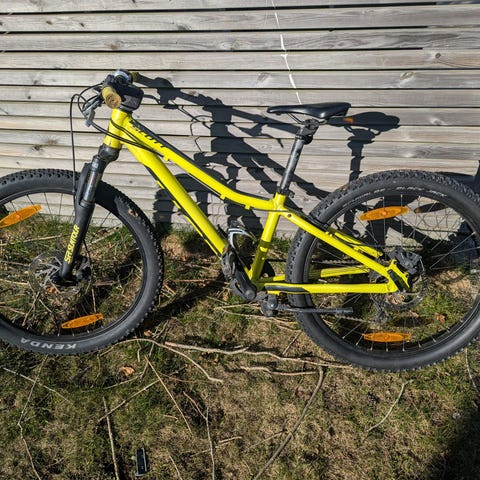 MBK mountainbike i unisexmodell med ramstorlek XS och 24" hjul. Cykeln har grovmönstrade däck anpassade för terrängkörning. Ramen är utformad för mindre cyklister och passar exempelvis barn eller kortare vuxna. Utrustad med handbromsar och växlar för varierande underlag. Färgsättning med svart ram och fälgar i två olika färger ger tydlig synlighet. Lämplig för cykling på grusvägar, stigar och annan lättare terräng.
