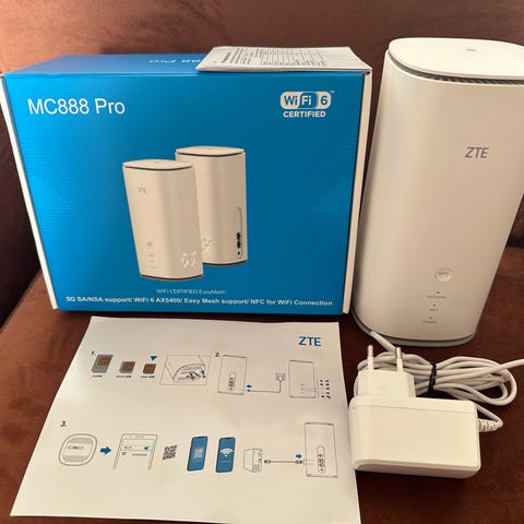 ZTE MC888 Pro router för trådlöst nätverk. Modellen stödjer 5G SA/NSA, WiFi 6 AX5400 och Easy Mesh. Routern har upp till 128 användare, upp till 1,25 Gbit/s uppladdning och upp till 4,67 Gbit/s nedladdning (beroende på operatör och nätverk). Utrustad med 2 RJ45 Gigabit Ethernet-portar, NFC för WiFi-anslutning, portvidarebefordran, föräldrakontroll och bryggläge. Fungerar med ZTELink-app för IOS och Android. Färg vit.
