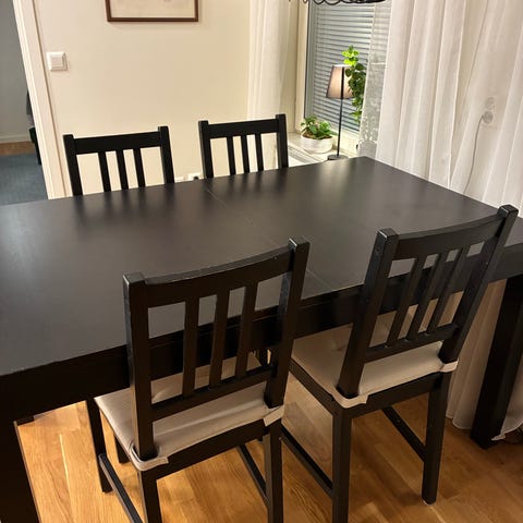 Fint matsalsbord med 6st stolar. Plus utdragsskiva och dynor. 1500kr