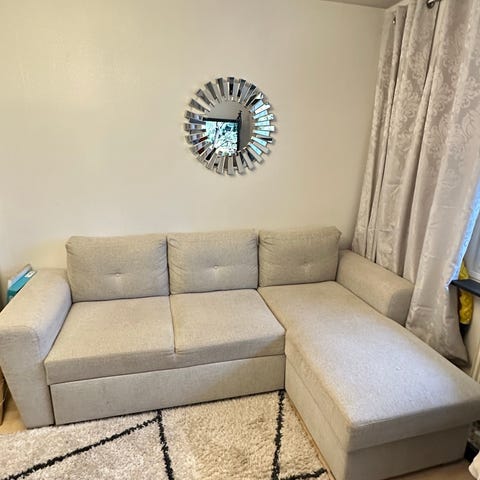 Skön bäddsoffa i mörkgrått tyg. Går snabbt att bädda ut. Sovyta 140x200 cm. Supernöjd med den, fast vi behöver större än 3-sits nu. Köptes förra sommaren på Jysk, sista bilden.