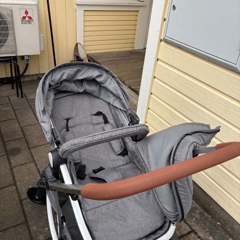 Fin och väldigt praktisk organizer. Extra fästanordningar med karbinhakar och tillköpta öglor. Vi har använt den till Babyjogger dubbelvagn