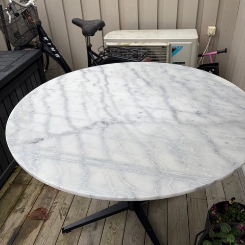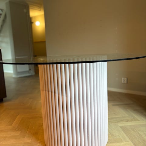 Bordsskiva i glas; diameter 135 cm; 1,7 cm tjock; fot i italiensk marmor.
