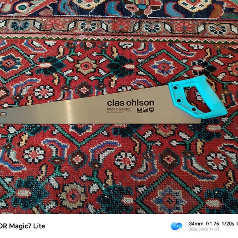 Biltema geringssåg med geringslåda. Sågen har rak klinga med handtag och är avsedd för kapning i fasta vinklar tillsammans med den blå plastlådan med försågade spår. Lämplig för arbete i trä och liknande material där precisa geringssnitt behövs, till exempel lister och mindre trädetaljer.