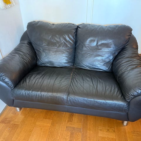 IKEA soffa i brun läderklädsel. Tvåsitsig modell med stoppade sitt- och ryggdynor samt armstöd på båda sidor. Soffan har ben som lyfter upp den från golvet och är anpassad för vardagsrum eller liknande sällskapsytor.