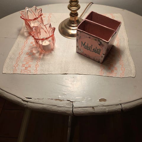 Vackert runt sidobord i trä med fin ådring och dekorativa detaljer.