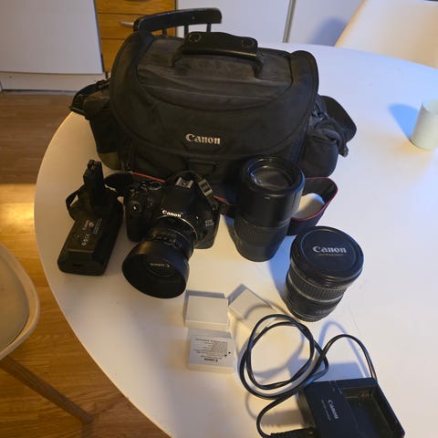 Säljer en Canon 1100D kamera med tillbehör! Allt är i gott skick, tror att 70-300mm objektivet kan ha någon liten skavank men ska annars fungera! Inte använd på ca ett år men ser bra ut och kollade att allt funkade.