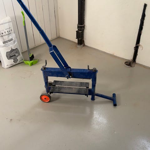 Utrustad med hjul för enklare förflyttning och handtag för manuell klippning av sten eller betongblock. Passar för arbete med stenläggning, kantsten och liknande markarbeten.
