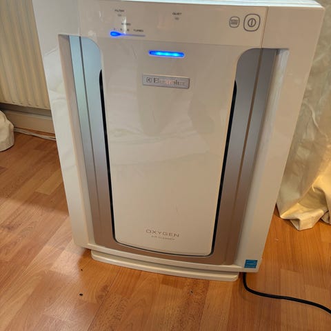 Electrolux EAP300 luftrenare i vit färg. Modellen är avsedd för 220–240V, 50/60Hz och har en effekt på 60W. Enheten har flerlagers filtersystem med förfilter och huvudfilter. Panelen upptill har reglage för fläkthastighet och olika driftlägen. Passar för inomhusbruk i bostad eller kontor för filtrering av rumsluft. Nytt HEPA-filter sattes in i december och ska bytas efter ett år, kolfiltret bör bytas var tredje månad så det kan vara dags för ett nytt.