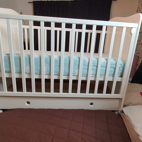Jollyroom spjälsäng i vit färg, har bara blivit uppmonterad i sonens rum men han ville aldrig sova i den. Har nu monterat ner sängen, madrass + överdraget + sidoskyddet på spjälsängen ingår med sängen.