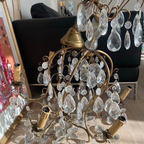 Vacker kristallkrona taklampa, acrylic colour Clear! Lampan levereras omonterad i originalkartong. Flera armar med dekorativa akryldelar och plats för flera ljuskällor. Avsedd för montering i tak, lämplig som belysning i exempelvis vardagsrum, matsal eller hall. Vintage!