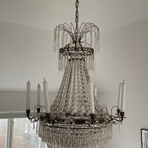 Taklampa kristallkrona med flera nivåer av klara prismor. Lampan är utformad som en klassisk kristallkrona med central rund stomme och fäm utsvängda armar med prismor. Passar som takbelysning i exempelvis vardagsrum, matsal eller hall. Ljuskällor monteras i hållare runtom kronan. Designer: