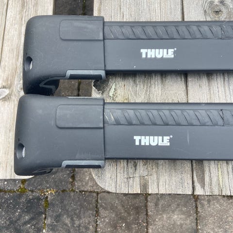Takräcken från Thule i fint skick. Aerodynamiskt utformade, ger tyst körning. Anpassade för upphöjda/öppna rails. Har T-spår. Nyckel finns.