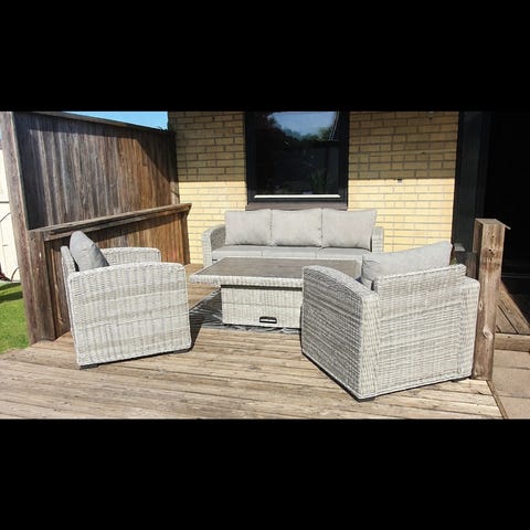 Bänksoffa i konstrotting med integrerat bord i mitten. Två sittplatser med grå sittdynor. Passar för uteplats, altan eller balkong. Bordet har en plan ovansida och förvaringshylla undertill. Färg på stomme: mörkgrå, dynor: ljusgrå. Tillverkad för utomhusbruk i väderbeständigt material.