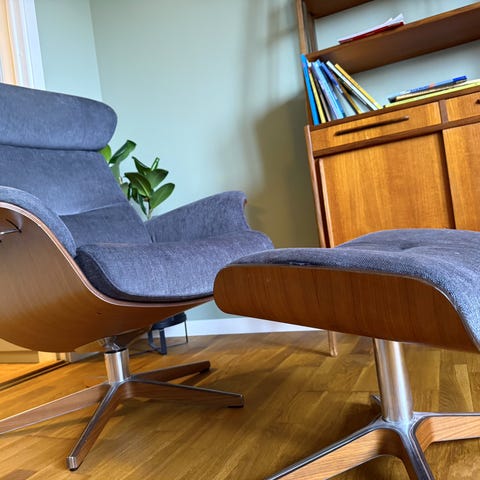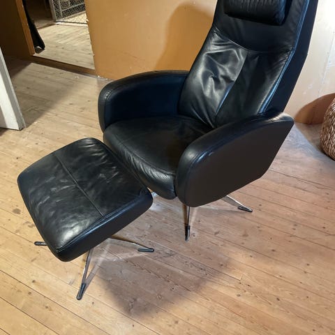 En Timeout fåtölj i svart läder från MIO i bra skick sparsamt använt säljes för 8000kr.