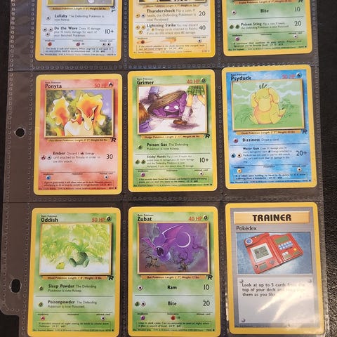 Pokémon samlarkort med blandade kort i plastficka. Motiven inkluderar olika Pokémon-figurer och tränarkort från spelet Pokémon Trading Card Game. Kortens språk och exakta utgåvor framgår av bilden. Lämpliga för samling, spel eller byte för den som samlar Pokémonkort.