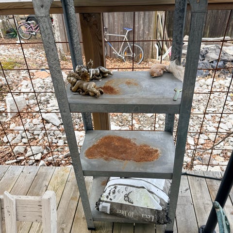 Hylla i plåt som har använts utomhus. Lite begynnande rost finns på ena hyllplanet, se bild.