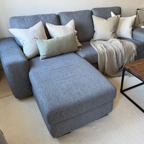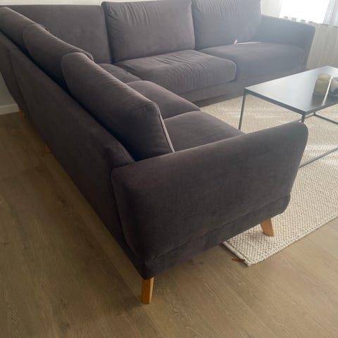 Soffa som jag tror är från Mio ursprungligen. Ljus blå/grå i färgen. Schäslong-delen går att ha på båda sidor av soffan.