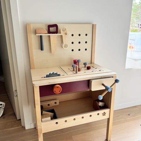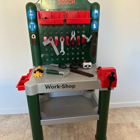 Säljer en snickarbänk med div verktyg i plast. Massa roliga tillbehör såsom hammare, såg muttrar, spikar mm samt en inbyggd bordcirkelsåg med ljudeffekt.