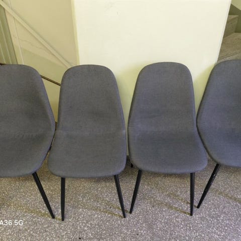 Säljer 4 st moderna och bekväma matstolar i grått tyg med svarta ben.