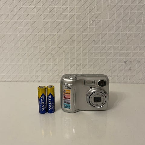 Canon PowerShot A520 digitalkamera i silverfärg. Kompaktkamera med utfällbart objektiv och inbyggd blixt. Baksidan har LCD-skärm och knappar för meny, navigering och uppspelning. Ovanpå kameran finns programvalsratten med flera exponeringslägen samt avtryckare. Drivs av utbytbara batterier och har plats för minneskort (typ enligt Canons specifikationer för denna modell). Lämplig för vardagsfotografering och enklare resedokumentation.