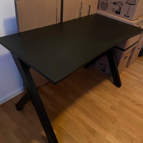 Säljer nu ett stabilt och snyggt skrivbord i svart utförande. Bordsskivan har en modern yta med kolfiber-textur som både ser bra ut och är slitstark. Perfekt som gamingbord eller för hemmakontoret.