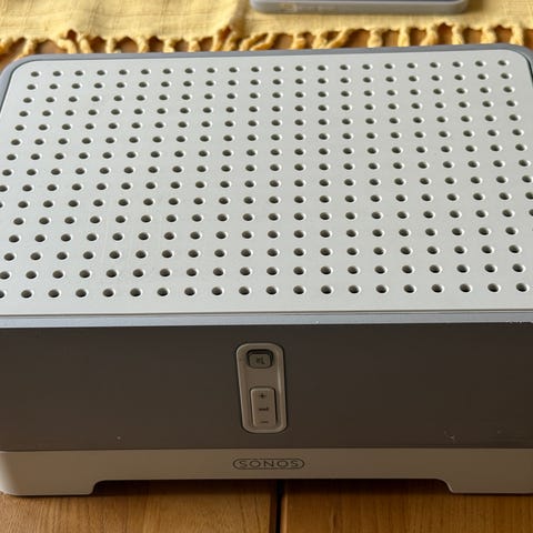 Sonos Connect nätverksspelare i vit färg. Enheten används för att ansluta befintlig stereo- eller hemmabioanläggning till Sonos-systemet för strömning av ljud. På baksidan finns analoga ljudutgångar (RCA), analoga ljudingångar (RCA), nätverksportar (Ethernet) samt strömanslutning. Enheten är avsedd för användning inomhus och ansluts till elnätet med standard nätsladd. Passar för integration av traditionell ljudutrustning i ett nätverksbaserat ljudsystem.