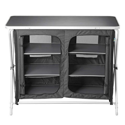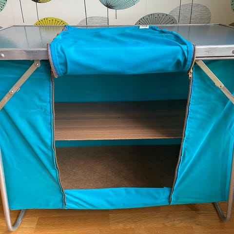 Quechua Air Seconds uppblåsbart förvaringsskåp med en volym på 260 liter. Skåpet är blått och vitt med uppblåsbar ram och tygväggar. Invändigt finns flera hyllplan för kläder och utrustning samt sidofickor i nät för mindre saker. Mått uppställd: cirka 140 cm högt, 70 cm brett och 80 cm djupt. Levereras i bärväska för enkel transport och förvaring, hopfälld storlek cirka 80 x 40 x 18 cm. Använt i 5 dagar, Nypris 1100kr.
